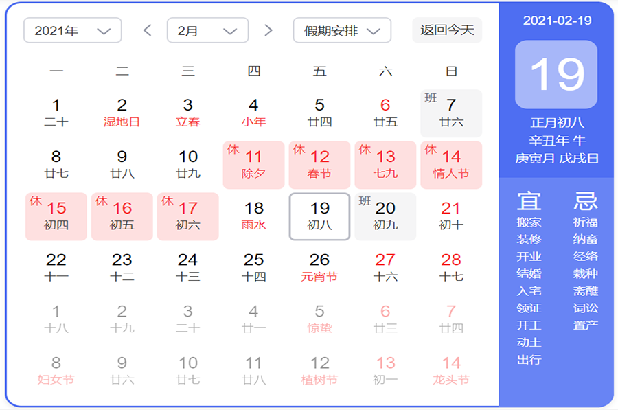 春節(jié)放假時間為2021年2月6日2月19日,春節(jié)后正式上班時間為2月19日(正月初八)上班。