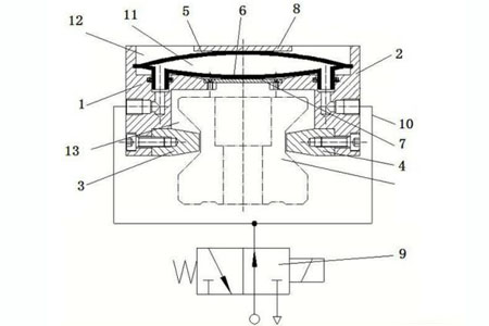 1、右座體 2、左鎖緊片 3、右鎖緊片 4、上彈簧鋼片 5、下彈簧鋼片 6、彈簧片 7、限位凸臺 8 和電磁閥 9,左座體和右座體相對鏡像設(shè)置,左座體和右座體上方中心設(shè)有限位凸臺 8,左座體 1 和右座體 2 經(jīng)彈簧片 7 固定連接,左座體 1 和右座體 2 上端中心設(shè)有彈簧鋼片腔 12,下端中心設(shè)有線軌滑塊移動腔 13,下端一側(cè)與左鎖緊片 3固定連接,另一側(cè)與右鎖緊片 4固定連接,左座體 1 和右座體 2 外側(cè)壁上分別設(shè)有氣體通道 10,限位凸臺分別與左座體和右座體固定連接,左鎖緊片 3 和右鎖緊片 4 相對設(shè)置,以利于對線軌滑塊進行夾緊制動,彈簧鋼片腔內(nèi)設(shè)有由上彈簧鋼片 5 和下彈簧鋼片 6 周邊密封連接而形成彈簧伸縮囊 11,彈簧伸縮囊 11 一端與左座體 1 固定連接,另一端與右座體 2 固定連接,上端與限位凸臺 8 相抵觸,下端與彈簧片 7 相抵觸,彈簧伸縮囊 11 上設(shè)有壓縮空氣出入口,氣體通道 10 一端與壓縮空氣出入口相連通,另一端與氣源相連通,以使彈簧伸縮囊 11內(nèi)填充有壓力氣體,氣體通道 10上設(shè)有電磁閥 9,以利于通過電磁閥 9自動控制彈簧伸縮囊 11 內(nèi)的氣體含量,使彈簧伸縮囊 11 帶動左座體 1 和右座體 2 相對移動或相背移動,進而實現(xiàn)自動調(diào)整左鎖緊片 3 和右鎖緊片 4 對線軌滑塊進行自動夾緊制動的作用。