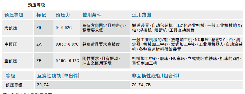 B、中預(yù)壓:標(biāo)示為ZA;預(yù)壓力為 0.05C-0.07C ;使用條件:輕負(fù)荷且要求高精度,適用于一般工業(yè)機(jī)械的Z軸,放電加工機(jī),NC車床,精密XY平臺(tái),測定器,機(jī)械加工中心,立式加工中心,工業(yè)用機(jī)器人,自動(dòng)涂裝機(jī),各種高速材料供給裝置