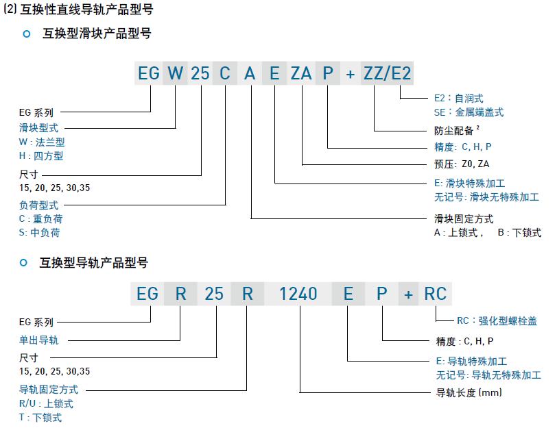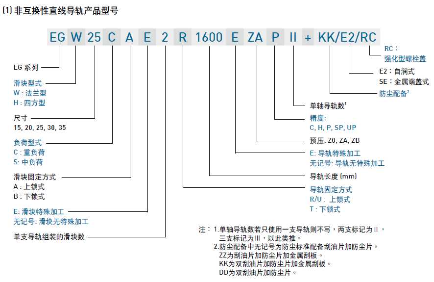 EG系列分為非互換性及互換性型兩種直線導(dǎo)軌,兩者規(guī)格尺寸相同,主要差異點(diǎn)在于互換性型之滑塊、導(dǎo)軌可單獨(dú)互換使用,較便利,但其組合精度無(wú)法達(dá)到非互換性型之超精密級(jí)以上的精度,不過(guò)由于HIWIN互換性型之組合精度目前已達(dá)到一定的水平,對(duì)不需配對(duì)安裝直線導(dǎo)軌的客戶而言,是一項(xiàng)便利的選擇。直線導(dǎo)軌的產(chǎn)品規(guī)格型號(hào)主要標(biāo)明直線導(dǎo)軌尺寸、型式、精度等級(jí)、預(yù)壓等規(guī)格要求,以利訂貨時(shí)雙方對(duì)產(chǎn)品的確認(rèn)。