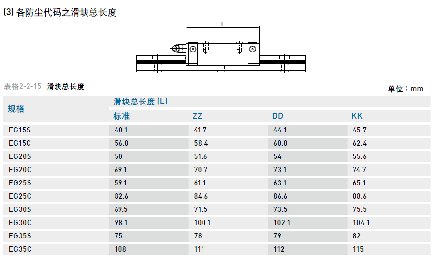 (3) 各防塵代碼之滑塊總長度