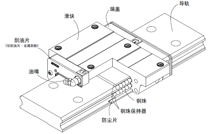 ? 防塵系統(tǒng):刮油片、底面塵封防塵片、導軌螺栓蓋、金屬刮板