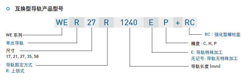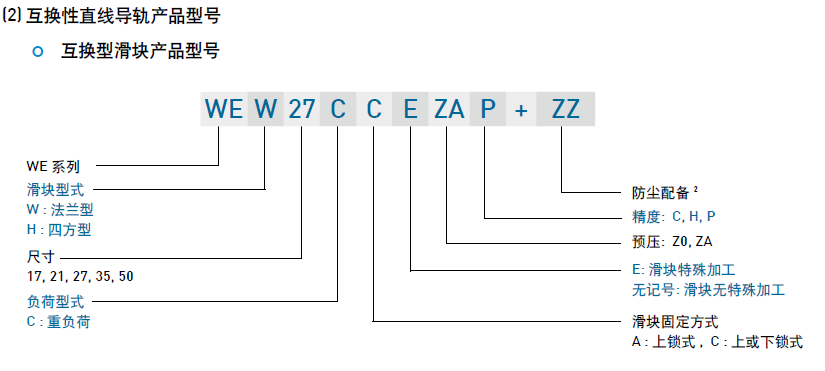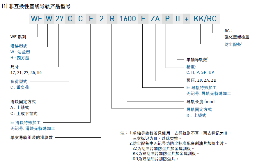 WE系列分為非互換性及互換性型兩種直線導軌,兩者規(guī)格尺寸相同,主要差異點在于互換性型之滑塊、導軌可單獨互換使用,較便利,但其組合精度無法達到非互換性型之超精密級以上的精度,不過由于HIWIN互換性型之組合精度目前已達到一定的水平,對不需配對安裝直線導軌的客戶而言,是一項便利的選擇。直線導軌的產品規(guī)格型號主要標明直線導軌尺寸、型式、精度等級、預壓等規(guī)格要求,以利訂貨時雙方對產品的確認。