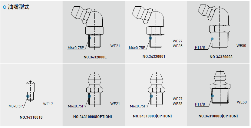 依客戶需要在滑塊前端或后端裝上油嘴以供手動打油,WE系列特別在端蓋側(cè)邊預(yù)留側(cè)油孔位置安裝油嘴(一般為直油嘴),提供側(cè)向打油,側(cè)向打油的位置建議在非側(cè)基準(zhǔn)邊,但若有特殊需要亦可放在側(cè)基準(zhǔn)邊??蛻羧缬猩鲜鰝?cè)向打油需求請與我們聯(lián)絡(luò)。WE系列在端蓋頂端亦預(yù)留上油孔位置,客戶若欲從端蓋上方供油,須使用直徑0.8mm的金屬針以預(yù)熱的方式,在指定位置將上油孔穿通,再將密封環(huán)安裝于凹處即可,避免使用鉆頭穿通上油孔,碎屑有污染油道的危險(xiǎn)。使用接管方式自動供潤滑油脂之直線導(dǎo)軌,則可依連接管型式選用安裝油管接頭。