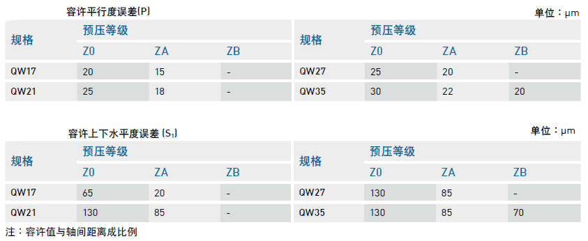 2、安裝平面誤差,直線導(dǎo)軌QW系列為圓弧兩點接觸式直線導(dǎo)軌,其自動調(diào)心的特性可以吸收安裝面的些許誤差而不影響直線運動的順暢性;下表中注明了安裝平面的容許誤差值: