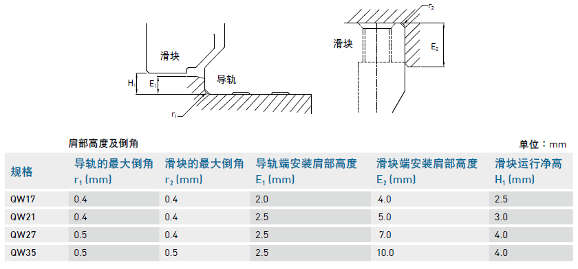 3、安裝注意事項, 我們在超導(dǎo)軌的時候,要注意安裝面肩部高度及倒角,安裝直線導(dǎo)軌時必須注意安裝面肩部的狀況是否適當(dāng),如倒角過大,凸出的地方易造成直線導(dǎo)軌精度不良,而高度過高則會干涉滑塊。故如果能依照建議要求安裝面肩部,安裝精度不良即可排除。下表為QW靜音安裝面肩部高度及倒角相關(guān)參數(shù)。