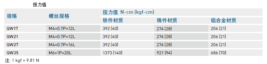 直線導軌精度甚劇,因此為達到每顆螺絲都能鎖緊的目的,建議使用下列扭力值鎖裝配螺絲。